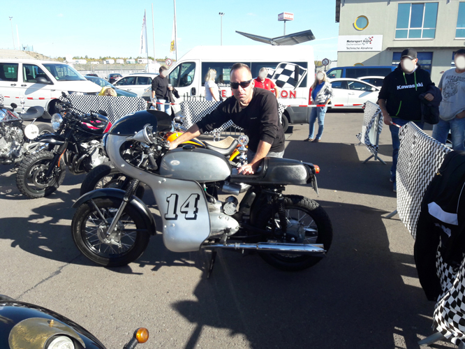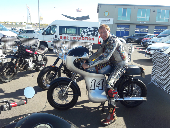 Bild 3 sitzend auf der Jawa die lebende Motorsportlegende auf der Isle of Man, Konrad Ammenhäuser anläßlich einer Veranstaltung in der Motorsport Arena in Oschersleben.